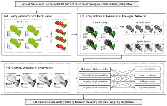 Habitat service zoning planning based on the ecological–social coupling perspective. (a–d) represent nature development, farmland protection, ecological priority, and economic advancement, respectively.