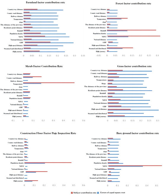 Figure 3: The key driver behind the rise in cultivated land is GDP, surpassing the threshold of 0.15. Following GDP, significant influences are exerted by NDVI and population density, whereas the slope contributes the least. The expansion of cultivated land is primarily directed towards the northwestern quadrant of Lanzhou. New forestation is concentrated within the protected natural reserves in the northwest and southeast. The dominant factor affecting forestation is precipitation, with NDVI, evapotranspiration, and temperature playing subsequent roles. Temperature is the predominant factor for shrubland growth, with the distance to county and township roads being the secondary influence. Accessibility via highways is the primary catalyst for grassland expansion, with elevation and residential area accessibility following suit. Due to constraints on model precision, the influence of each factor on water body expansion is rated as zero. For construction land, the primary determinants of the increase in area are population density, GDP, and elevation, with population density being the most impactful. NDVI is the main influence on the spread of bare land, with population density being the second most influential. The impact of residential site accessibility is minimal.