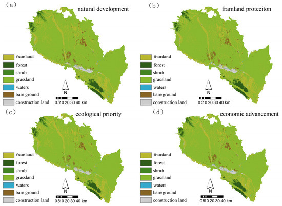 Figure 4. Multi-scenario simulation of land use. (a–d) represent nature development, farmland protection, ecological priority, and economic advancement, respectively. - (2)