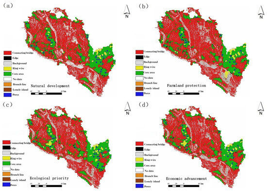 Analysis of landscape components. (a–d) represent nature development, farmland protection, ecological priority, and economic advancement, respectively.