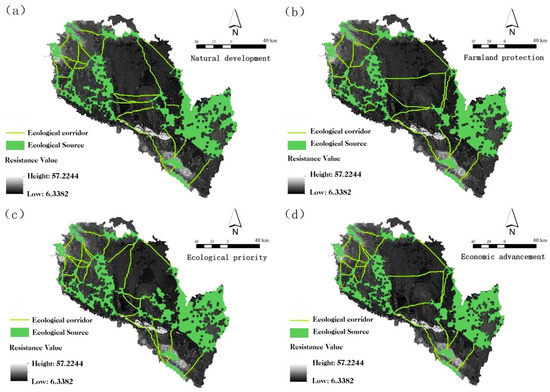 Leveraging Linkage Mapper, we have constructed an ecological corridor across various development scenarios, including natural development, farmland protection, ecological priority, and economic advancement (refer to Figure 6a–d). This initiative aims to establish a robust ecological security framework. The findings indicate that the northwestern corridor is densely populated, primarily extending beyond ecological hotspots, with the corridor network displaying a tripartite network structure. Under natural development conditions, we observe a total of 31 corridors spanning 636 km; 32 corridors covering 537 km; 37 corridors stretching over 623 km; and 32 corridors under economic development, totaling 610 km. Across these four development scenarios, the ecological corridor exhibits a tri-level distribution pattern, encompassing northwestern, central, and southeastern segments. In the natural development scenario, the northern region lacks any transverse corridors. During farmland protection efforts, the northern area is similarly affected. In contrast, the ecological priority scenario results in a denser network of northwestern corridors and the emergence of transverse corridors in the central urban area. Lastly, under economic advancement conditions, the number of corridors in each region is notably diminished.