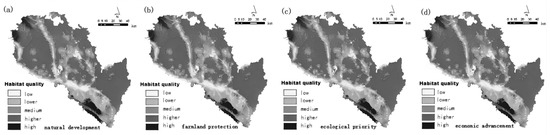 Spatial distribution of habitat quality in multiple scenarios. (a–d) represent nature development, farmland protection, ecological priority, and economic advancement, respectively.