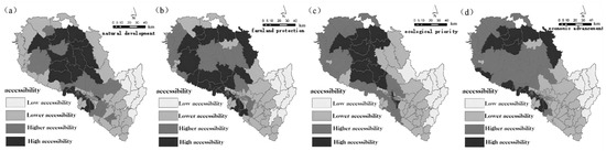 Spatial distribution of accessibility in multi-scenario ecological networks. Figure (a–d) show the natural development, Figure (c–h) show the farmland protection, Figure (i–l) show the ecological priority, and Figure (m–p) show the economic advancement scenario.