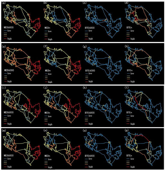 Spatial syntax, pioneered by Bill Hillier and fellow scholars, delves into the intricate interplay between space, human society, and resident activities by quantitatively assessing spatial structures [38]. This methodology finds application in the exploration of network structures and other spatial environments. Within this research framework, leveraging the SDNA (Spatial Design Network Analysis) module on the GIS platform, we selected two pivotal indicators: MED for close centrality and BTE for mediation centrality. These indicators aptly mirror the fluidity of organisms within the network environment. We employed the global analysis radius, with MED signifying the level of network accessibility and BTE the potential for traffic flow, both of which hold equal importance and are evenly weighted to evaluate the accessibility of our established ecological space network.