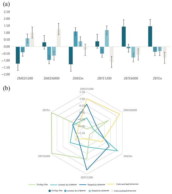 By utilizing the Z-score standardization method, the outcomes for four distinct scenarios in Lanzhou were derived (Figure 10). Across various analytical radii, with the exception of the MED at a 6000 m radius, scenarios prioritizing ecological considerations exhibit commendable network accessibility. As the radius expands, the MED indicators for the remaining three scenarios, aside from the global analysis, reveal a favorable progression in the order of economic advancement, natural development, and farmland protection. In terms of BTE, each scenario demonstrates a unique hierarchy of network accessibility. Apart from the ecological priority scenario, natural development achieves its peak at a radius of 1200 m, economic advancement at 6000 m, and natural development excels at the global radius (Figure 10a). The comprehensive radar chart indicates that the prioritization of the four scenarios, from most to least favorable, is as follows: ecological priority, natural development, economic advancement, and farmland protection (Figure 10b).