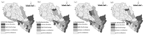 - High-quality, low-accessibility areas. The aforementioned four scenarios constitute 36.1%, 34.2%, 32.9%, and 32.9%, respectively. These are further subdivided into four categories, prioritizing management from severe disorder to mild disorder, primary coordination, and good coordination. Under the natural development scenario, these subdivisions are primarily located at the city’s northwest edge, while the other three scenarios are distributed throughout the central and eastern regions of the city.