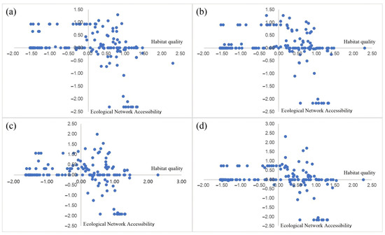 Z-score-normalized scatter plot of ecological network accessibility. (a–d) represent nature development, farmland protection, ecological priority, and economic advancement, respectively.