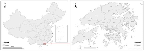 The study area is in Hong Kong, located on the southern coast of China (Figure 1). Hong Kong has a total population of over 7.3 million, with an urban population density of 47,890 people per square kilometer in some street blocks [53]. Hong Kong, as one of the world’s most compact cities, is characterized by exceptionally high development and population density, reflected in its high plot ratio and highly fragmented UGSs [13]. In densely populated urban areas, the development of new UGSs is challenging. Against this backdrop, IGSs provide a feasible strategy for enhancing outdoor living environments and represent a promising alternative solution for the severe lack of UGSs in Hong Kong.