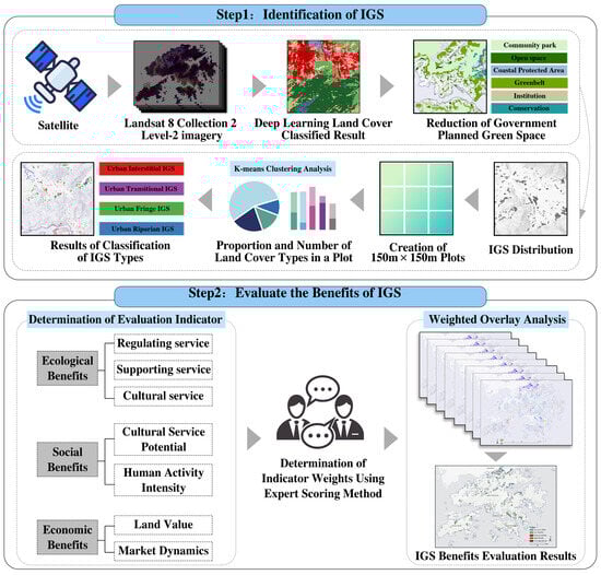 Figure 2 shows the workflow of this study. Step 1 involves classifying land cover types in Hong Kong using Landsat 8 satellite imagery and deep learning, followed by screening and extracting IGS through government planning data. The datasets used at each step are summarized in Table 1. We established a 150 m × 150 m grid system over the identified IGSs. Subsequently, K-means clustering was applied to analyze land use types and quantities within each grid cell and classifies the IGSs into four defined categories based on the clustering results. To determine the optimal number of clusters for the K-means clustering model, we calculated the sum of squared errors for K = 2–10 and observed the elbow curve. This curve exhibited a distinct inflection point at K = 4, beyond which the marginal reduction in the sum of squared errors became negligible; thus, we adopted four clusters. Following clustering, we aggregated the land cover composition of each cluster and assigned semantic labels based on the dominant IGS type within these clusters and performed satellite image verification, categorizing the IGSs as Urban Interstitial IGSs, Transitional IGSs, Fringe IGSs, and Riparian IGSs. Descriptive statistics for grid-level metrics (mean, median, standard deviation, minimum, maximum, sample size) are also reported to assess internal consistency and interpretability within clusters. Step 2 focuses on constructing an evaluation framework encompassing ecological, social, and economic benefits. We employ expert scoring methods to determine indicator weights and conduct weighted overlay analysis to calculate the comprehensive value of each IGS category. Finally, we utilize the natural breaks (Jenks) method (minimizes within-class variance and maximizes between-class variance) to categorize benefits into five levels (very low–very high) [55,56], thereby revealing the spatial distribution, ecological–social–economic value, and integrated benefits of different IGS types within Hong Kong’s high-density environment. Here, IGSs are defined as green-cover pixels identified by semantic segmentation that are not designated as UGS in the government planning layers listed in Table 1.