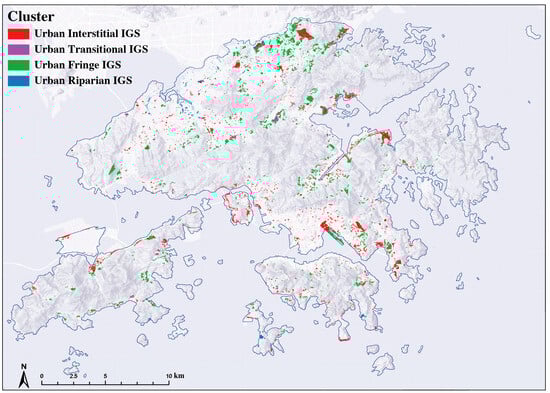 The IGSs in Hong Kong exhibit a fragmented spatial pattern and can be categorized into four IGS types: Urban Interstitial IGSs, Transitional IGSs, Fringe IGSs, and Riparian IGSs. Among these, Urban Interstitial IGSs and Fringe IGSs are the most abundant, while Riparian IGSs are the least common.