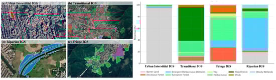 Urban Interstitial IGSs (Panel (a)), Transitional IGSs (Panel (b)), Fringe IGSs (Panel (c)), and Riparian IGSs (Panel (d)). A stacked bar plot of land cover proportions by the IGS types listed in Section 3.1. is also shown.