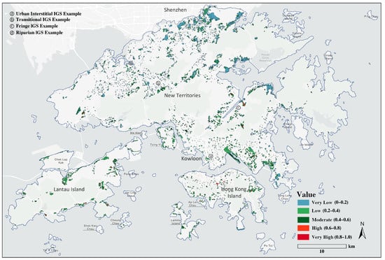 Transitional IGSs are primarily situated between low-density urban areas, with regions of higher benefits concentrated in the southeastern part of Hong Kong’s outlying islands and the New Territories (Figure 6). These areas feature relatively diverse land cover and possess certain advantages in terms of ecological benefits (0.4611). The gas regulation (0.0655) is relatively high, falling between urban Fringe IGSs (0.0229) and Riparian IGSs (0.0582), and its climate regulation (0.0663) also performs well, ranking in the upper-middle range, indicating that the area has potential in regulating temperature and air quality (Table 4). However, the social benefits of this area are relatively low, with a low population density (0.0106), less commercial infrastructure (0.0078), and less educational infrastructure (0.0361), resulting in moderate overall benefits (0.0968).