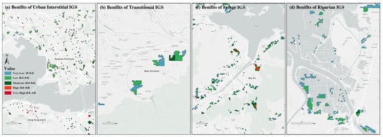 This study analyzes the various types of IGSs in Hong Kong. Through data analysis (Figure 5 and Table 4), it was found that the potential benefits of Urban Interstitial IGSs are the most significant, while those of Riparian IGSs are relatively lower (Figure 5). The potential benefits of Transitional IGSs and Fringe IGSs fall within the intermediate range (Figure 5).
