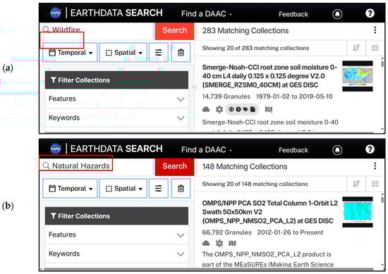 Search examples based on NASA’s Earthdata Search geoportal (Available online: https://search.earthdata.nasa.gov/search, accessed on 19 September 2025). (a) Query result for “Wildfire.” (b) Query result for “Natural Hazards”.