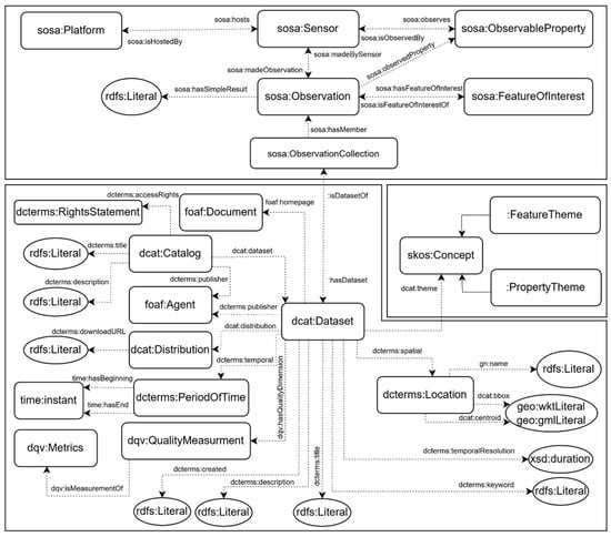 As mentioned, the DCAT and its geospatial extension GeoDCAT-AP provide a structured model for catalog-level metadata, including spatial and temporal extent, responsible organizations, and data-access mechanisms. However, they do not offer explicit constructs for describing the observational context in which data is generated. To address this limitation, the SOSA ontology is integrated. SOSA is used for bringing observation context, like in situ observations and remote sensing imagery. It defines a set of observations as a collection, giving the main properties of the observation context. SOSA has been preferred over alternatives like the Observation and Measurement (O&M) model due to its flexibility and integration with the broader Semantic Sensor Network (SSN) ontology, which adds crucial capabilities in representing observation contexts. The SSN ontology builds on the SOSA ontology and includes more intricate details about the sensors’ operational ranges, accuracy, and other properties, facilitating a richer representation of sensor networks and their data. In Figure 3, this is shown through linking dcat:Dataset to sosa:ObservationCollection and enabling relationships between sosa:Observation, sosa:Sensor, sosa:Platform, sosa:ObservableProperty, and sosa:FeatureOfInterest.