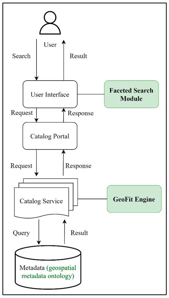 As shown in Figure 5, the system architecture extends the conventional geoportal model (black components) by incorporating additional components (in green) to support enhanced capabilities. The core added component is the GeoFit Engine, which integrates an ontology-based approach for semantic enrichment and data processing. The GeoFit Engine is integrated within the catalog service, enhancing its capabilities while maintaining alignment with the conventional geoportal system architecture. This engine interacts with the ontology-based metadata to perform complex queries and generates an optimal list of ranked results by calculating the semantic similarity between user-searched queries and the themes of datasets. The Faceted Search Module is integrated into the user interface, allowing the dynamic filtering and updating of search results based on user interaction. This module sends queries to the catalog portal, which then forwards them to the catalog service and the GeoFit Engine, ensuring refined and relevant search results are presented back to the user.