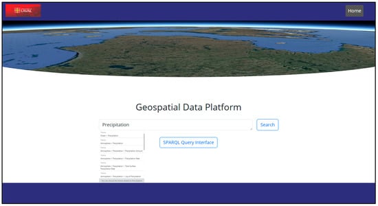- User Search Interaction: The system’s web interface is designed with a user-centric approach to streamline data discovery. As shown in Figure 6, users start by entering a search query into the system’s web interface. This search box supports free-text queries, allowing users to input keywords or phrases related to the geospatial data they are looking for. Additionally, the interface includes a button for SPARQL queries, enabling users to perform advanced and precise searches using SPARQL. The auto-completion function calculates the semantic distance between the search query and theme terminologies, suggesting possible themes during typing.