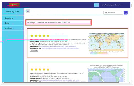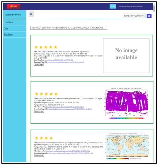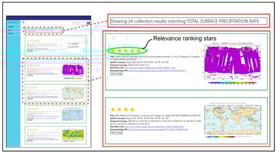 Despite Wildfire being categorized under natural hazards, the query for “Wildfire” returns more results than “Natural Hazards”. Moreover, most geospatial search engines primarily use simple keyword-based matching methods [13]. In the keyword-based approach, the system identifies correspondences between the keywords provided by the users and the textual annotations associated with geospatial assets [15,16]. As mentioned by Quarati et al. [17], the reliance of most geospatial search engines on basic keyword matching fails to accurately reflect the user’s intent or accommodate preferences for multidimensional data characteristics. For example, when a user searches for “hourly water level,” the system might individually consider ‘hourly’, ‘water’, and ‘level’, failing to grasp that the user is specifically interested in datasets regarding water levels on an hourly basis. This issue illustrates a significant misalignment between how users phrase their searches and what they are truly looking for, pointing to a fundamental limitation in accurately capturing the user’s search intent. This issue, combined with the overwhelming volume of data returned by searches, underscores the need for more sophisticated search capabilities that can better accommodate users’ specific needs and preferences [18].