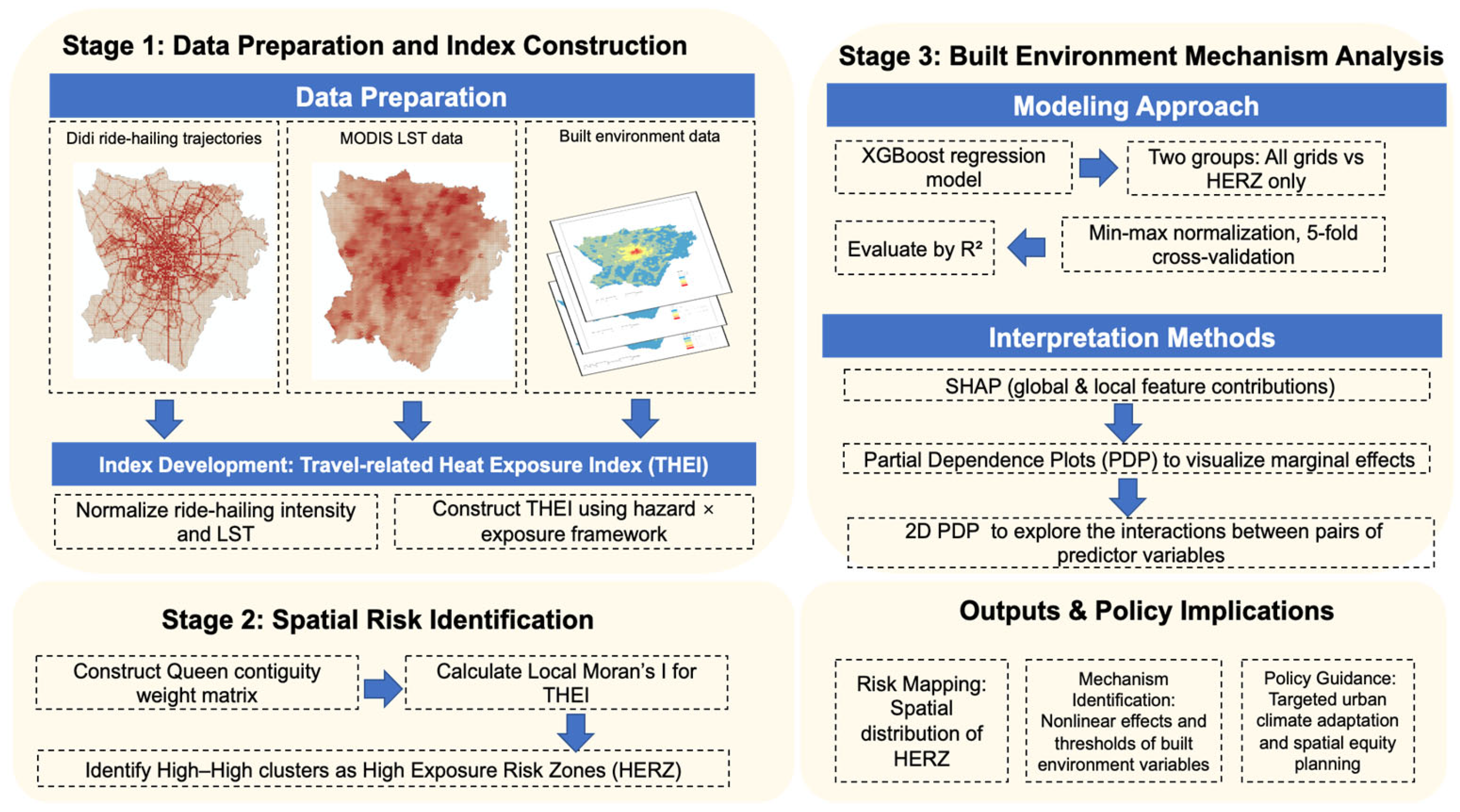 Construction of the THEI: Based on ride-hailing travel intensity and Land Surface Temperature (LST) data, a composite heat exposure indicator is developed to reflect the interaction between human activity and thermal environments, following the modeling logic of “risk intensity × exposure frequency”.