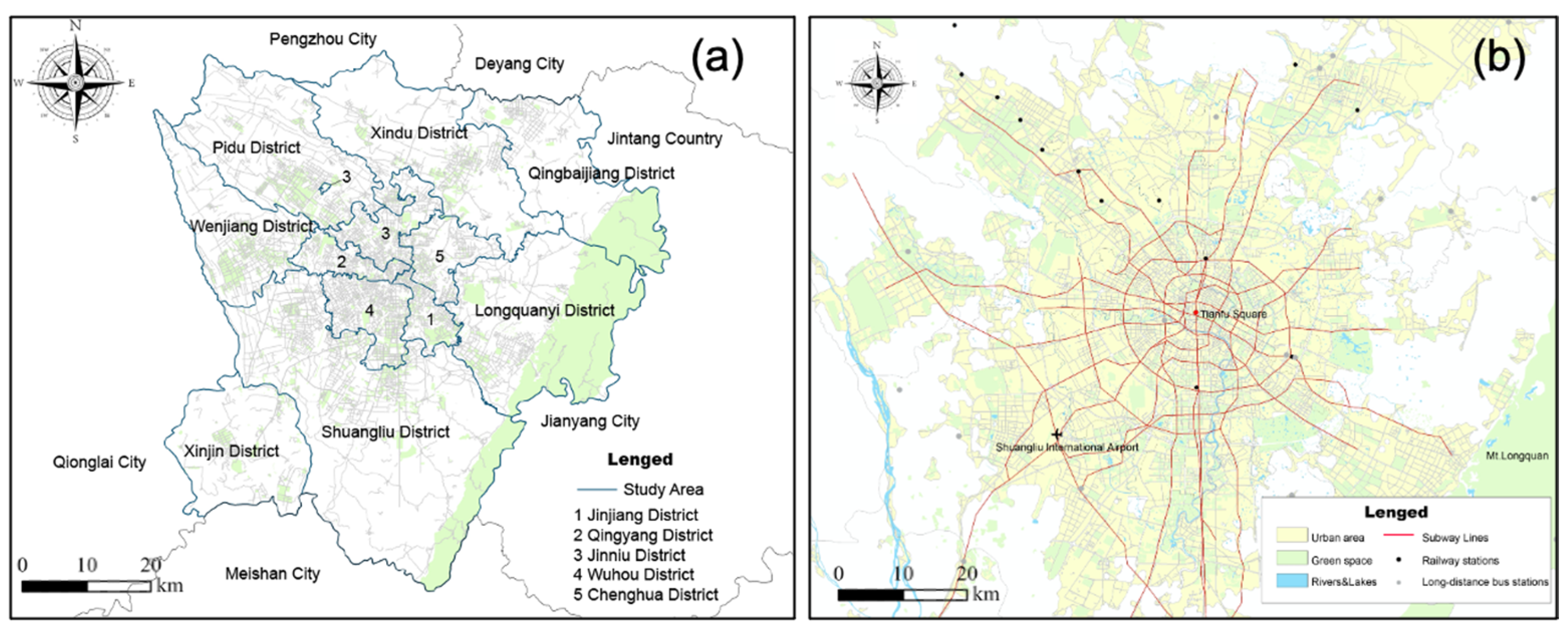 The study area includes 12 administrative districts: Jinjiang, Qingyang, Jinniu, Wuhou, Chenghua, Longquanyi, Qingbaijiang, Xindu, Wenjiang, Shuangliu, Pidu, and Xinjin, covering a total area of 3639.81 km