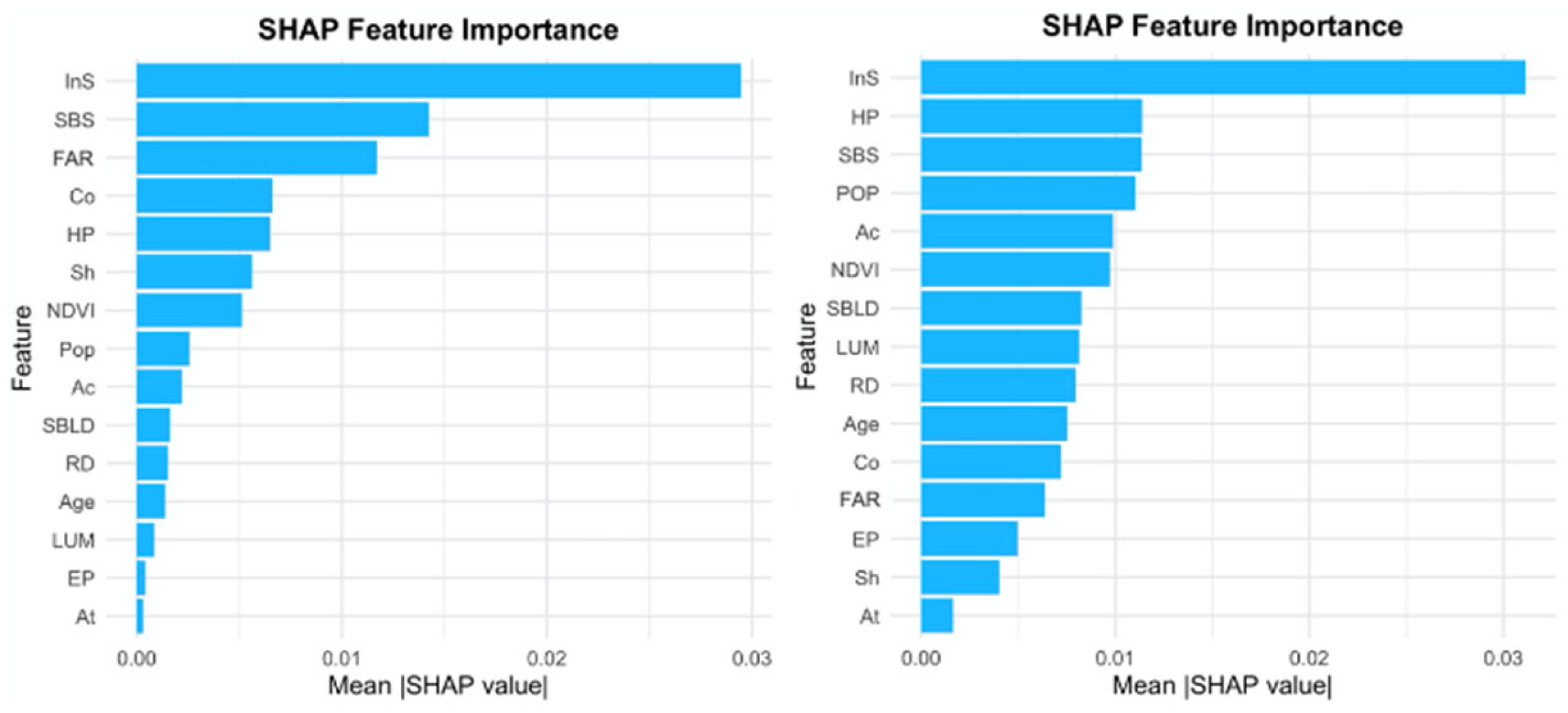 Across the study area, InS emerged as the most critical factor, demonstrating the highest SHAP values and indicating a substantial increase in exposure due to concentrated traffic flow, anthropogenic heat emissions and disrupted ventilation corridors. Subway and bus station (SBS) distribution also played a key role, reinforcing thermal stress by aggregating pedestrian flows and transit-related activity. The FAR and HP showed moderate to high contributions—FAR intensified heat accumulation in compact urban canyons, whilst HP reflected the socioeconomic centrality of urban cores. Co, Pop and RD provided positive contributions but with weaker effects, indicating that urban form and economic intensity jointly influence exposure patterns. In contrast, the NDVI consistently demonstrated negative associations, highlighting the cooling function of vegetation through evapotranspiration and shading. Other factors, such as land use mix (LUM), shopping point density (Ac) and entertainment point density (EP), demonstrated scattered or weak SHAP values, indicating a limited role at the city-wide scale.