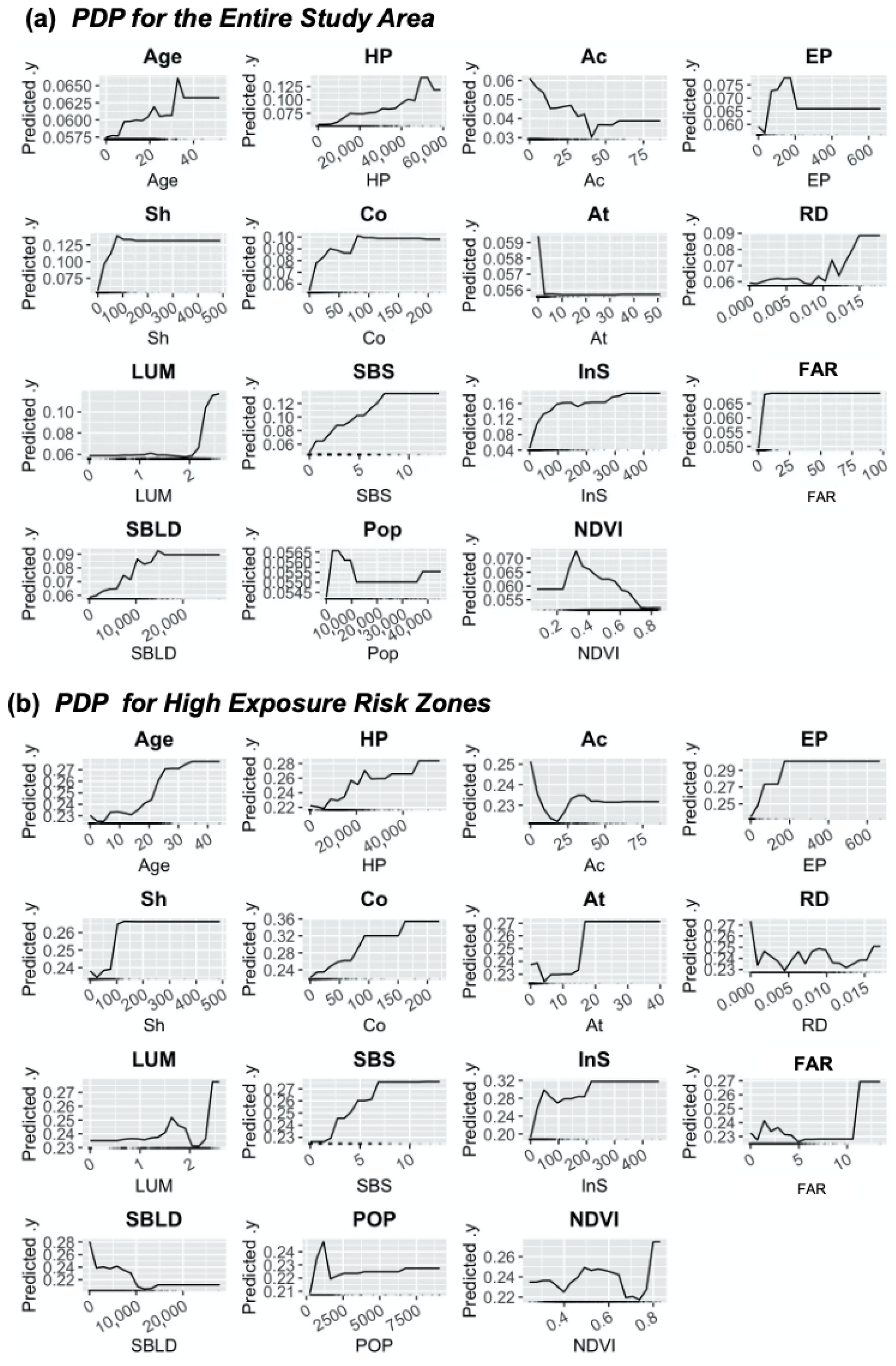 Figure 7b), response patterns shift significantly. The NDVI exhibits a steeper negative correlation, especially in the mid-range, indicating enhanced cooling efficacy in high-risk zones where heat stress is amplified, aligning with SHAP findings on vegetation’s amplified mitigation potential. PDPs for population density (Pop) and intersection density (Ins) become more pronounced, with sharper upward trajectories and lower thresholds, signaling that demographic intensity and traffic nodes exacerbate exposure risks in vulnerable areas. Meanwhile, traditional morphological indicators such as building density (SBLD) and company density (Co) show downward or flattening trends, suggesting saturation effects where further densification offers limited additional impact. Instead, variables like road density (RD) and land use mix (LUM) display more volatile patterns, pointing to a transition toward activity-driven dynamics, while socioeconomic factors (HP, Age) maintain positive slopes, revealing persistent inequalities linking affluence, aging infrastructure, and heightened vulnerability.