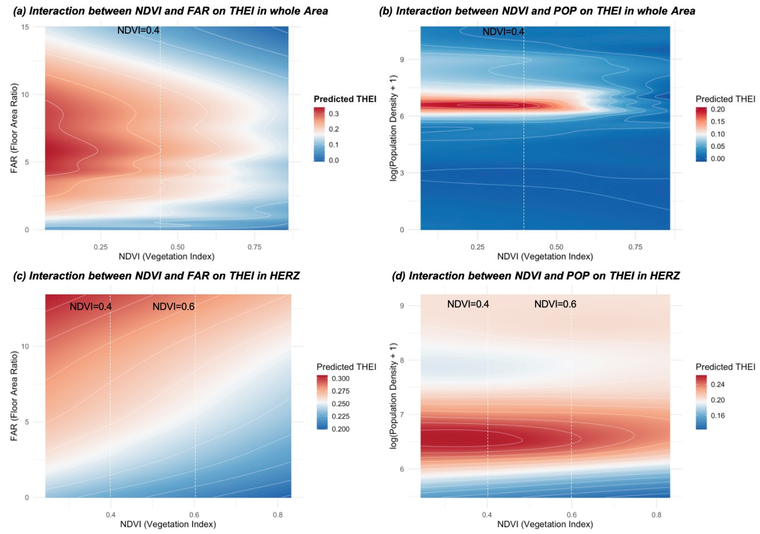 Next, we visualized the joint effects of the NDVI and FAR, and NDVI and Pop on THEI predictions by plotting two-dimensional partial dependence plots (2D PDP) for both the full region and the HERZ region.