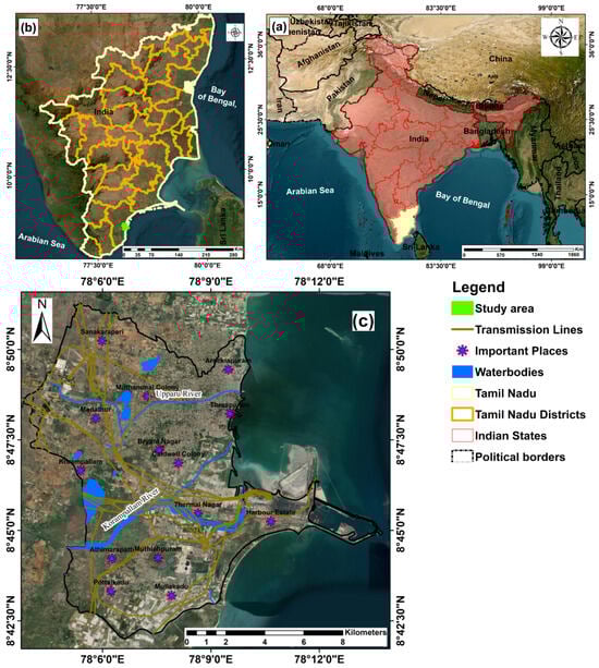 (a) Geographical context of the study area within South Asia; (b) Administrative boundaries of Tamil Nadu State, southern India; (c) High-resolution map of Thoothukudi city using Landsat 8 (RGB 752).