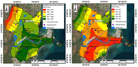 Spatial distribution of photovoltaic factors (a) Global Horizontal Irradiance (GHI) and (b) Diffuse Radiation.