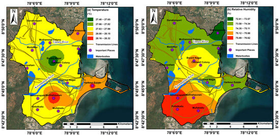 Spatial distribution of climatic factors (a) Temperature and (b) Relative Humidity.