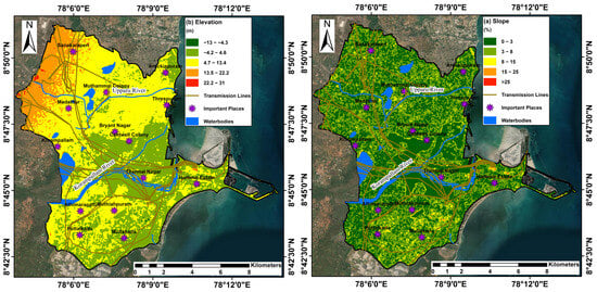 The elevation (Figure 5b) pattern reveals a diverse topographic landscape with significant implications for solar farm development, ranging from below sea level depressions to elevated inland zones. The Lowland Zone (4.7–13.4 m) constitutes the largest portion of the municipal area at approximately 71.18 km2 (52.28%), forming a central band that encompasses areas around Muthammal Colony, Threspuram, Athimarapatti, portions of Thermal Nagar, and extends to Korampallam and Mullakkadu. The Coastal Zone (−4.2–4.6 m) comprises approximately 50.15 km2 (36.83%) of the total area, predominantly distributed in a concentric pattern around Bryant Nagar and Caldwell Colony, extending eastward to Harbor Estate and southern portions near Mullakkadu, creating a transitional zone between the central lowlands and the coast. The Midland Zone (13.5–22.2 m) accounts for about 14.41 km2 (10.58%) observed along the western boundary near Sankaraperi and Madathur, forming a distinct elevational gradient that rises from the central lowlands. The extreme elevation categories, such as Upland Zone (22.2–31 m) and Subsea Zone (−13 to −4.3 m), are less occupied, with 0.42 km2 (0.3%) of the study area with the highest elevations appearing as isolated patches in the western corners of the region.