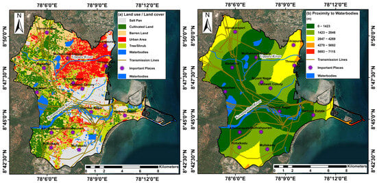Spatial distribution of environmental factors (a) Land use, Land cover and (b) Proximity to Water bodies.