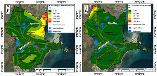 Spatial distribution of accessibility factors (a) Proximity to Transmission lines and (b) Proximity to Road networks.