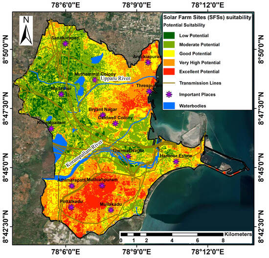 The integration of all parameters through weighted overlay analysis reveals the comprehensive spatial pattern of solar potential suitability across the study area with varying potential that can directly inform strategic renewable energy planning and investment prioritization within the urban coastal context [24,64]. The Weighted Sum Overlay method in ArcGIS generated the comprehensive Solar Potential Suitability Index (SPSI), with weights derived from AHP analysis. The SPSI values were classified into five distinct categories representing different levels of suitability for solar farm development (Figure 8). The distribution of solar potential suitability zones across the study area is presented in Table 5. Moderate Potential zones emerged as the most prevalent category, covering 44.13 km2 (32.41%), predominantly seen in the northwestern part around Sankaraperi and Madathur with scattered patches near Thermal Nagar. Very High Potential zones constitute the second largest category at 38.33 km2 (28.15%), located primarily in the southeastern coastal sections near Mullakkadu and Pottalkadu, as well as in patches distributed throughout the eastern portions near Arockiapuram and Threspuram. Good Potential areas cover 30.34 km2 (22.29%), forming extensive zones throughout the central areas around Bryant Nagar and Caldwell Colony, extending into the harbour area. Excellent Potential zones representing optimal locations for solar farm development encompass 13.61 km2 (9.99%), concentrated primarily in the southwestern portions, including areas south of Mullakkadu and Athimarapatti. Low Potential areas comprise 9.74 km2 (7.16%), appearing as scattered patches primarily in the northwestern section in constrained locations.