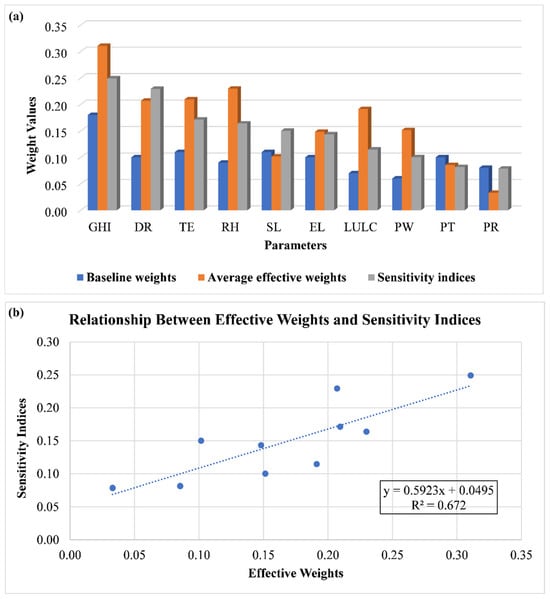 Parameter Weight Analysis and Sensitivity Assessment for Solar Potential Model (a) Comparative bar chart of Weight measures and Sensitivity, and (b) Scatter plot illustrating the relationship between Effective weights and Sensitivity indices.