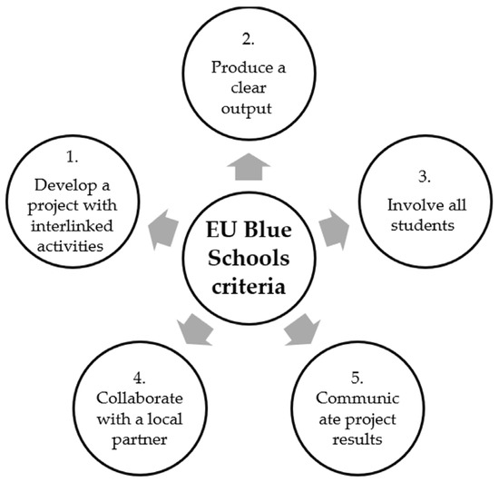 Core criteria for EU Blue Schools certification as defined by the Network of EU Blue Schools. The diagram provides the policy and operational context for the projects analysed in this study.