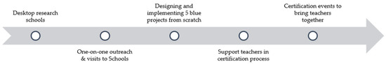 While the European Blue Schools framework presents a promising approach, its adoption remained limited, with only 40 schools [10] applying for certification by the end of 2021 under a top-down strategy. This prompted the authors to explore whether bottom-up approaches might be more effective for educational institutions, given their daily operational commitments. To test this hypothesis, a grassroots strategy was implemented in a localized setting, with the island of Mallorca chosen as the pilot case. With support from the Erasmus+ program, the authors, along with two additional partners [11], initiated a pilot project aiming to certify 100 schools, equivalent to one in three schools on the island. This strategy was structured into key phases (Figure 2): conducting background research on schools through websites and social media, engaging in one-on-one outreach, facilitating school visits, developing five model Blue School projects as multipliers, supporting teachers throughout the certification process, and organizing certification events to recognize achievements.