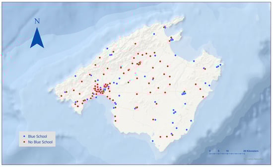 Distribution of schools in Mallorca included in the study. Certified EU Blue Schools are shown in blue, while non-certified schools are shown in red. This baseline map highlights the geographic spread of schools across both coastal and inland municipalities.