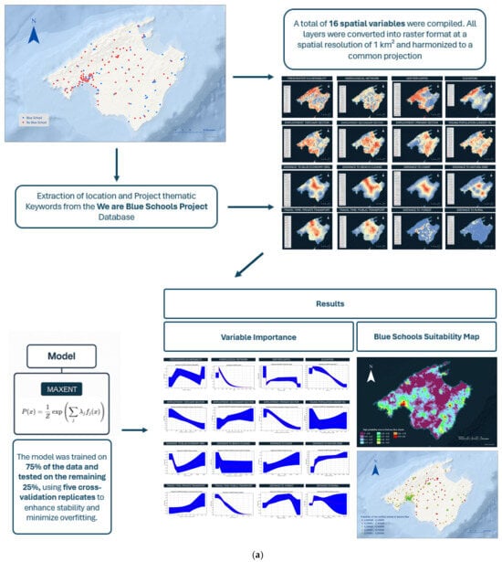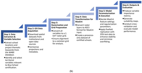 The methods applied in this study follow a structured workflow that integrates geospatial data collection, variable preparation, and MaxEnt modeling to assess the territorial determinants of Blue School certification. An overview of this workflow is provided in Figure 4, which combines a conceptual schematic (Figure 4a) with a detailed technical roadmap (Figure 4b). Together, these panels illustrate the data sources, spatial processing steps, and modeling procedures described in the following subsections.