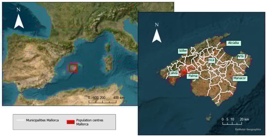 Mallorca, the largest island in Spain’s Balearic archipelago, features a diverse geography: the Serra de Tramuntana mountains in the northwest, the fertile Es Pla plain in the centre, and a heavily urbanized southern coastline anchored by Palma. As of the first quarter of 2025, continuous census data indicate Mallorca’s population stood at approximately 967,322 inhabitants, marking a 0.7% growth compared to the previous year [39,40]. The island encompasses 53 municipalities, with 27 coastal municipalities, providing varied environments for marine education and experiences (see Figure 5).