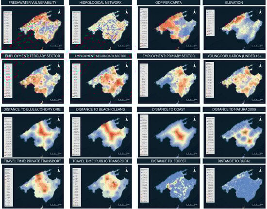 The spatial and socio-economic variables used in the Maxent model were derived from a combination of publicly available datasets and original geospatial analyses (Figure 6). Proximity to Blue Economy organizations was calculated through custom mapping using data provided by Ports de les Illes Balears [44] and the Balearic Association of Marine Enterprises [48]. Travel time to the coast via public and private transport was modeled using data from Transport Illes Balears [49], while straight-line distance to the coast was calculated through original GIS processing.