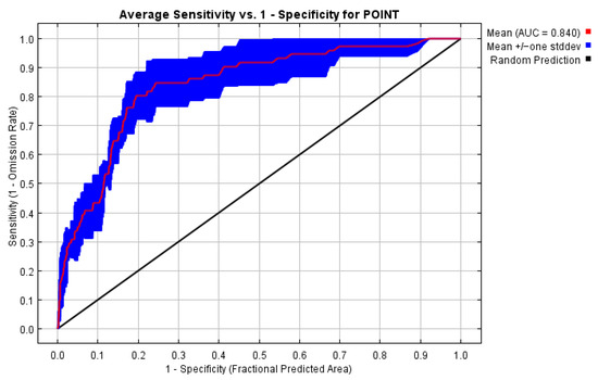 The MaxEnt model exhibited strong predictive performance, achieving an average test AUC (Area Under the Curve) of 0.840 across five cross-validated replicates, with a standard deviation of ±0.044 (Figure 7). This high AUC value indicates excellent discriminatory power in differentiating between locations with and without Blue School certification. In practical terms, it reflects a well-calibrated balance between sensitivity (true positive rate) and specificity (true negative rate), confirming the model’s robustness in identifying areas of high suitability based on the selected geospatial predictors.
