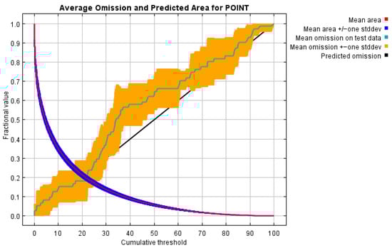 Average omission rate and predicted area across fivefold cross-validation of the MaxEnt model. The graph displays how omission error varies with cumulative threshold values, indicating the model’s ability to discriminate between observed and background points. Lower omission rates and stable predicted area curves reflect higher model accuracy and reliability.