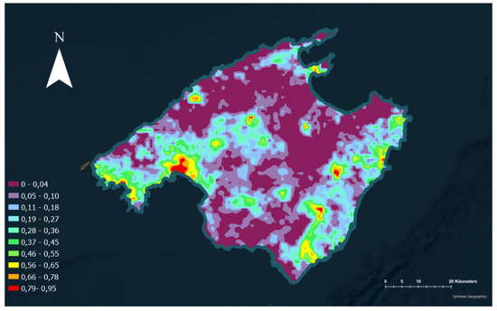 Land classification data for identifying rural and urban areas, as well as forest coverage, were sourced from the CORINE Land Cover inventory [53]. Natura 2000 protected areas, the hydrological network, and freshwater vulnerability indicators were acquired from the Balearic Spatial Data Infrastructure [54]. Elevation data were derived from the Copernicus Digital Elevation Model [55].
