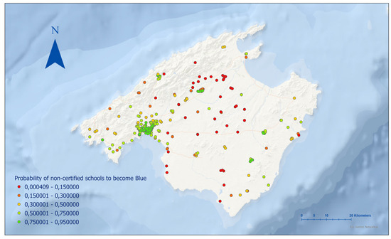 Following the generation of the median prediction surface, we extracted the predicted suitability value at each known school location in Mallorca. This allowed us to assign a spatial probability score, ranging from 0 to 1, to both certified and non-certified schools across the island. By juxtaposing the full population of schools with the prediction map, we were able to identify high-suitability schools that have not yet been certified. This spatial overlay serves as a practical tool for prioritizing outreach and capacity-building efforts, particularly in inland or underserved areas that exhibit strong alignment with the territorial drivers of certification identified by the model.