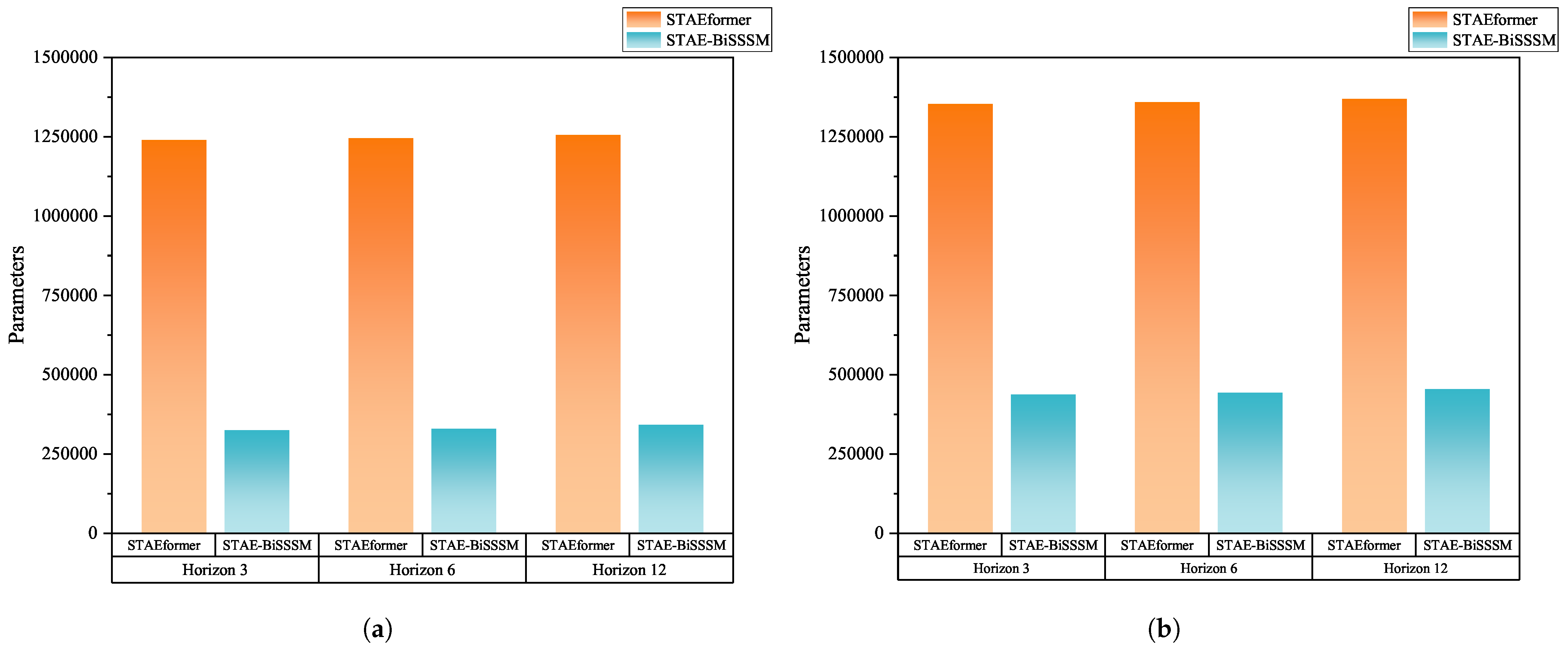 - Compared with STAEformer, STAE-BiSSSM has higher parameter effectiveness. While possessing superior performance, the number of trainable parameters of STAE-BiSSSM is much less than STAEformer.