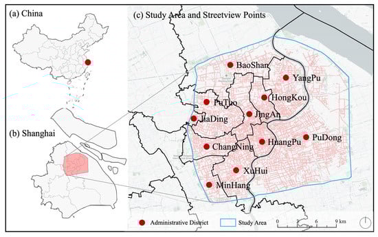Study area. (a) Map of China; (b) Map of Shanghai; (c) Study area and street view points.