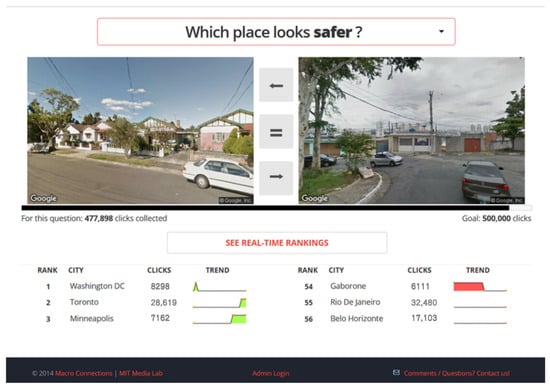 MIT Place Pulse 2.0 data collection platform interface (https://www.media.mit.edu/projects/place-pulse-1/overview/ (accessed on 1 August 2025)). The volunteers were asked to choose one of two images to reflect their perception of them.