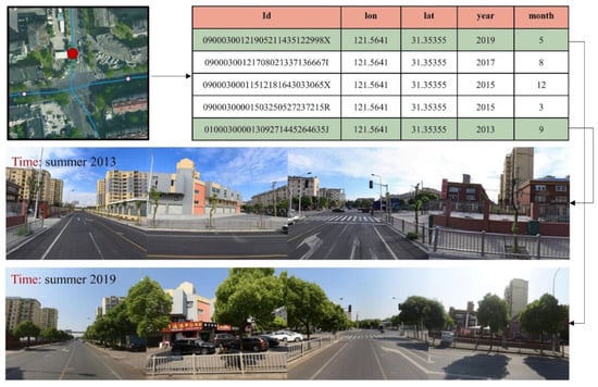To analyze changes in human perception of urban areas, this study collected street view imagery from two different years within the central urban area of Shanghai. The images were obtained through an automated script developed to retrieve data from the Baidu Maps platform (https://map.baidu.com (accessed on 1 August 2025)) [] and were integrated with road network data downloaded from OpenStreetMap. A total of 71,546 street view sampling points were generated along the road network at 50-m intervals. Each sampling point includes imagery from multiple years, resulting in a dataset comprising 214,377 street view records. To ensure the temporal validity and comparability of the data, two filtering criteria were applied to the sampling points: (1) Only points with street view imagery available for both 2013 and 2019 were retained, allowing for the analysis of perceptual changes between fixed time periods; and (2) The acquisition time of streetscape images is constrained by the availability of map service providers and cannot cover all seasons throughout the year. Considering the significant perceptual differences between lush summer vegetation and leafless winter landscapes, this study limits the image collection period to May through October—when vegetation remains largely intact—in order to minimize the impact of seasonal factors on perception outcomes.