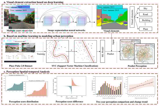 Overall research design. Our research consists of three main parts: (a) Image segmentation and visual element extraction; (b) SVC model training and perception prediction; (c) Perception spatial-temporal analysis.